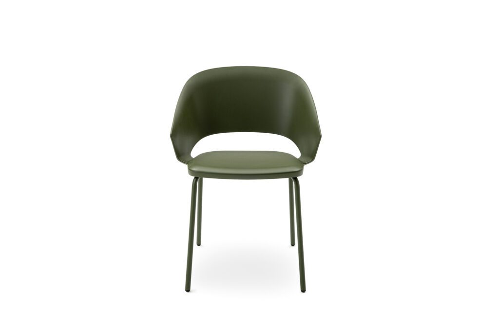 La structure est en métal laqué, robuste mais visuellement aérienne. L’assise et le dossier sont disponibles en plusieurs finitions (polypropylène, rembourrage tissu ou cuir) permettant une personnalisation selon le type d’espace à aménager. Son style s’adapte aussi bien à une salle de conférence épurée qu’à un restaurant moderne ou une salle de classe contemporaine.