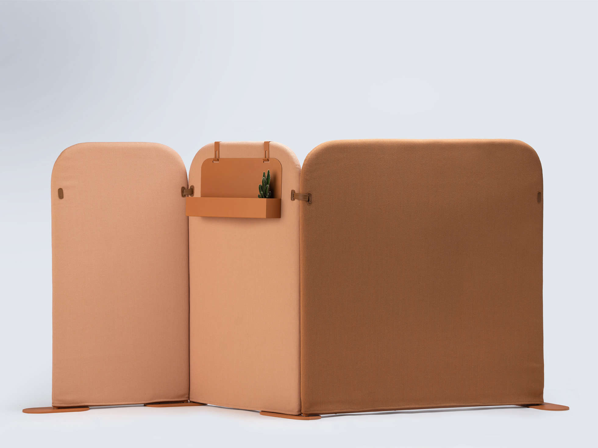 La structure interne est constituée d’un cadre discret, robuste, parfaitement intégré dans l’épaisseur textile. L’ensemble conserve une finesse visuelle, sans armature visible, et une grande stabilité grâce à des bases élargies en métal thermolaqué, disponibles dans plusieurs finitions. Le système de connexion entre les modules est simple, rapide et sécurisé, permettant un assemblage intuitif sans outils. Le paravent peut ainsi être utilisé comme élément modulaire autonome ou intégré dans une scénographie globale de séparation de zones.