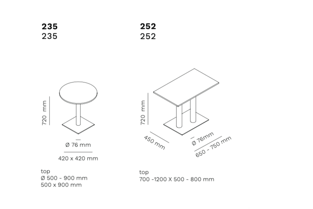 La table 235/252 est disponible en plusieurs tailles standard ou sur mesure, pour convenir à toutes les configurations d’aménagement : salle de réunion, open space, salle de classe, showrooms, ou espace événementiel. Le plateau peut être de forme rectangulaire, carrée ou circulaire selon les besoins. Le nom 235/252 fait référence aux dimensions et variantes techniques possibles dans cette gamme précise.